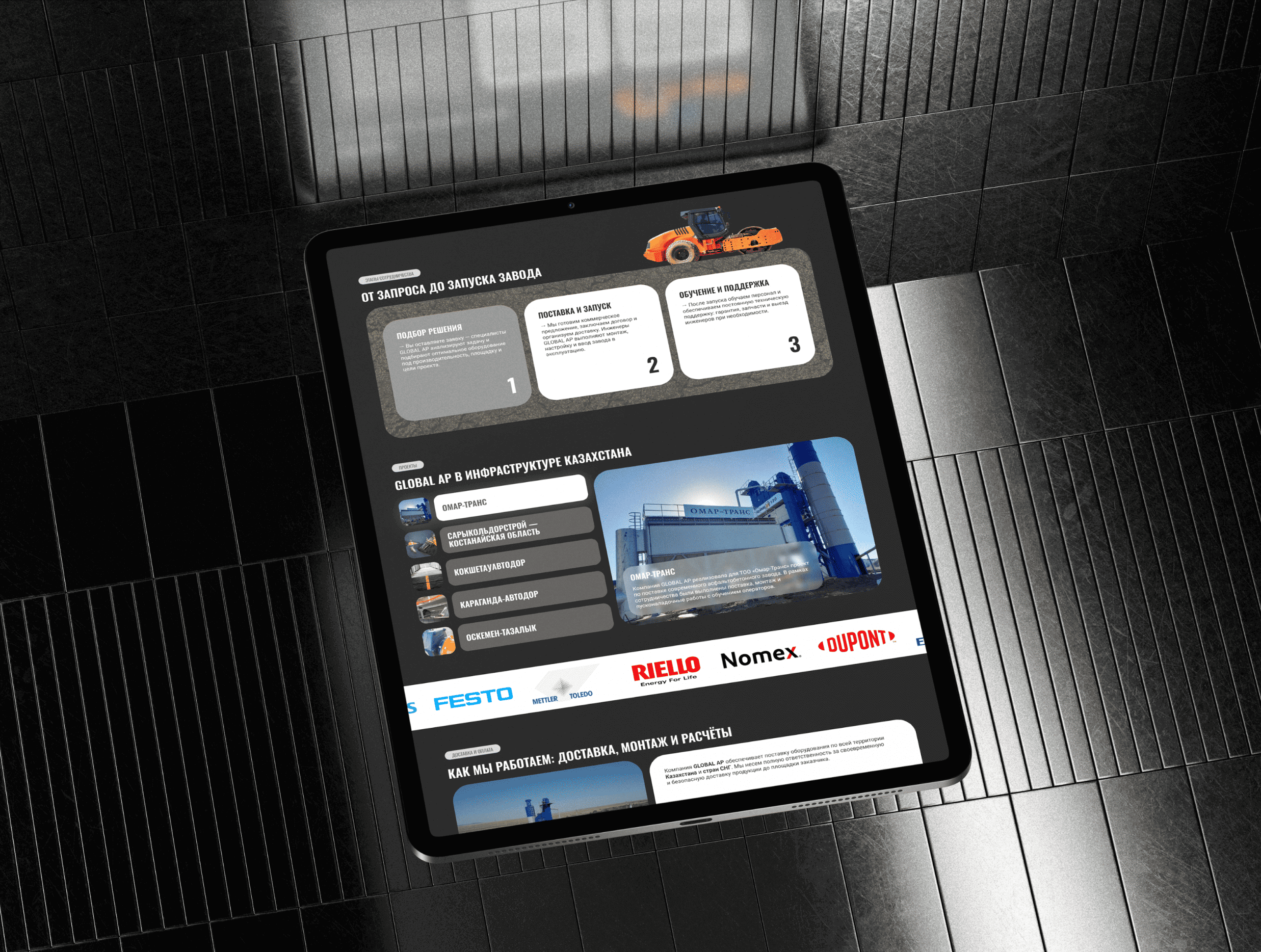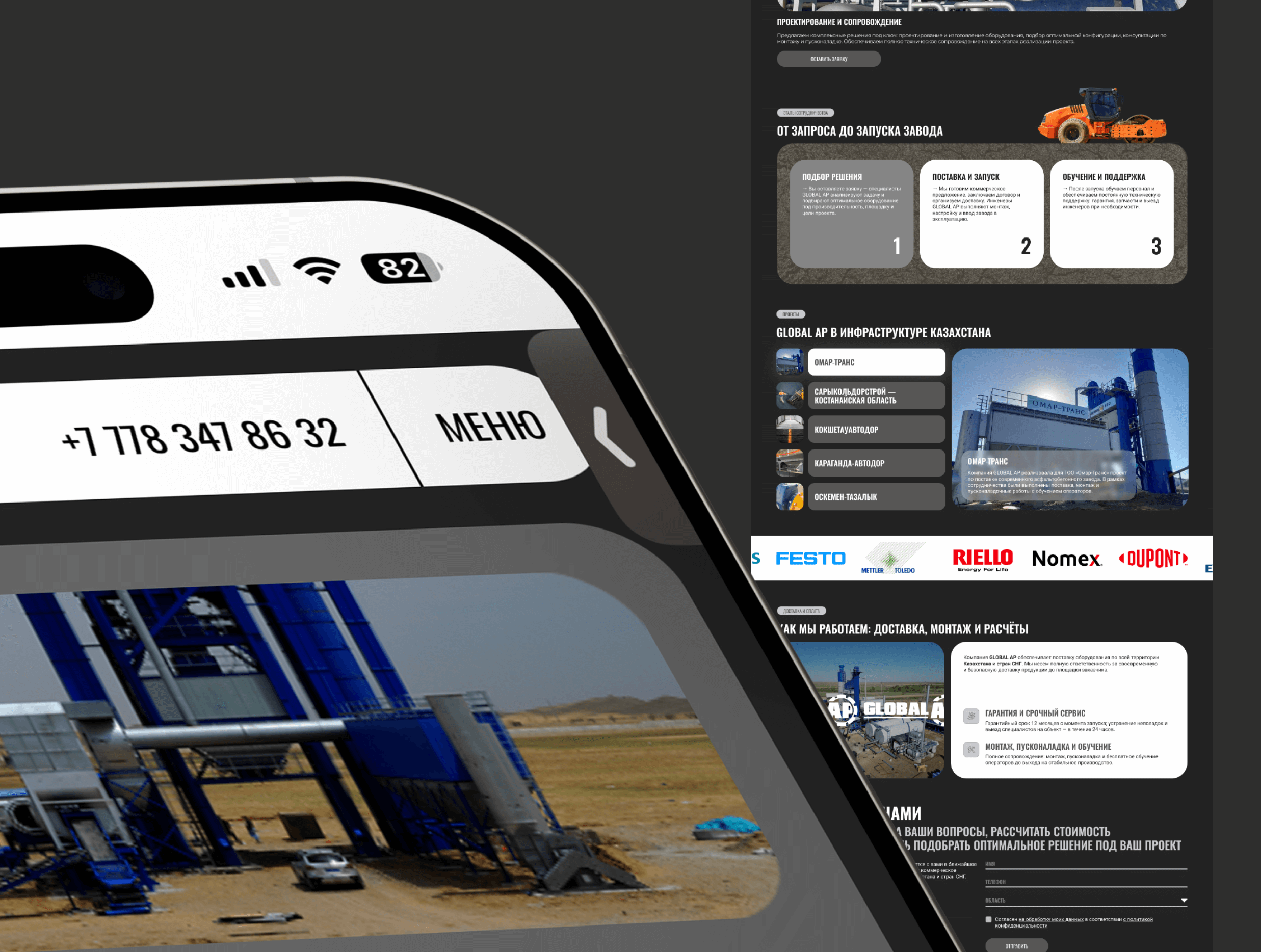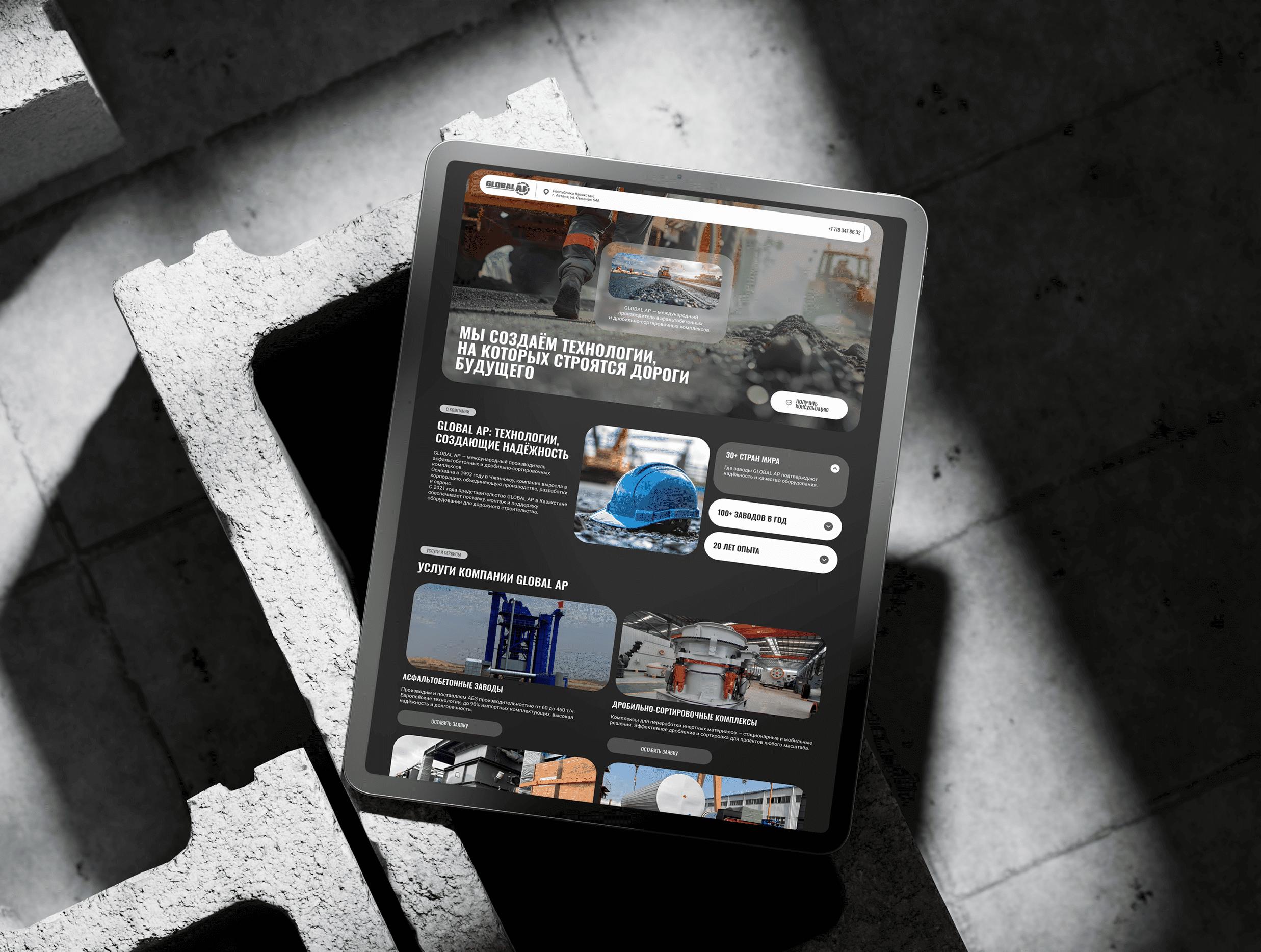 На момент старта работ у Global AP был лишь простой одностраничный лендинг. Такой формат категорически не соответствовал реальному масштабу бизнеса, где компания является крупным международным производителем, работающим в Казахстане и по всему СНГ. Действующий сайт не раскрывал экспертность, не показывал широкую линейку продукции и десятки реализованных проектов.